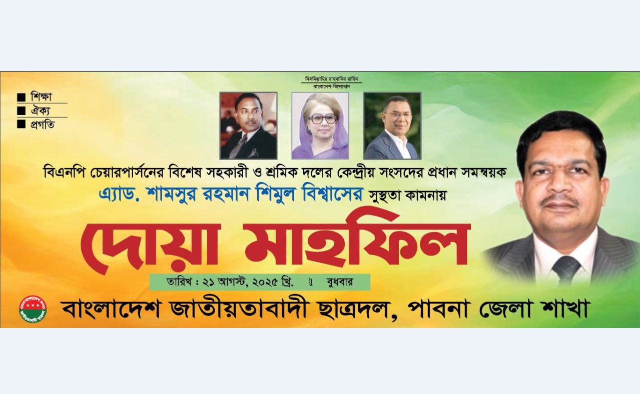বিএনপি চেয়ারপারসন দেশ নেত্রী বেগম খালেদা জিয়ার বিশেষ সহকারী ও শ্রমিক দলের কেন্দ্রীয় কমিটির প্রধান সমন্বয়ক পাবনার গণ মানুষের নেতা অ্যাড. শামসুর রহমান শিমুল বিশ্বাসের সুস্থতা ও রোগ মুক্তি কামনায় মিলাদ ও দোয়া মাহফিল অনুষ্ঠিত হয়েছে। বৃহস্পতিবার বাদ আছর পাবনা জেলা ছাত্রদলের উদ্যোগে পাবনা আমিনুদ্দিন আইন কলেজ মাঠে এ মিলাদ ও দোয়া মাহফিল অনুষ্ঠিত হয়।